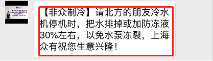 5:冷水機(jī)冬季停機(jī)時(shí),把水倒掉或者在管路中加入防凍液30%左右,防止氣溫過低結(jié)冰將水泵以及管路凍裂;