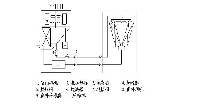 室外側(cè)翅片換熱器作為蒸發(fā)器,室內(nèi)側(cè)翅片換熱器作為冷凝器,壓縮機(jī)排出的制冷劑高溫氣體在室內(nèi)側(cè)翅片換熱器冷凝成液體后經(jīng)膨脹閥節(jié)流降壓成為低溫氣體混合體,再流入室外側(cè)翅片換熱器吸收熱量蒸發(fā)后回到壓縮機(jī),完成一個制冷循環(huán);同時,從室內(nèi)來的回風(fēng)(或新風(fēng))經(jīng)過室內(nèi)側(cè)翅片換熱器(這時為冷凝器)后則被加熱升溫,處理后的熱風(fēng)由室內(nèi)側(cè)風(fēng)機(jī)再送入室內(nèi)。