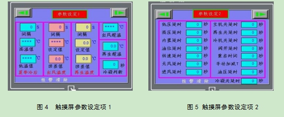 參數(shù)設(shè)定包括:觸摸屏參數(shù)設(shè)定及電氣元件參數(shù)設(shè)定。觸摸屏參數(shù)設(shè)定項(xiàng)如圖 4、圖 5 所示。電氣元件參數(shù)設(shè)定項(xiàng)主要包括壓縮機(jī)排氣超溫報(bào)警值,噴液溫度值,主加熱超溫值、再生加熱超溫值,壓縮機(jī)吸氣低壓報(bào)警值,壓縮機(jī)排氣高壓報(bào)警值,主風(fēng)道無(wú)風(fēng)報(bào)警值, 主風(fēng)道超壓報(bào)警,冷凝風(fēng)機(jī)過(guò)載,主風(fēng)機(jī)過(guò)載,壓縮機(jī)過(guò)載等