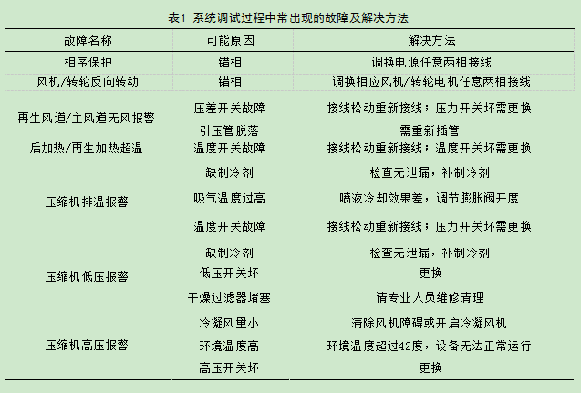 為了確保調(diào)試過(guò)程中人身設(shè)備安全,在除濕機(jī)調(diào)試前(斷電情況下)應(yīng)先確保各電器元件安裝型號(hào)正確。然后,檢查電氣接線,確保接線端子全部緊固,確定線路接線正確,其絕緣性能,系統(tǒng)接地均符合要求。