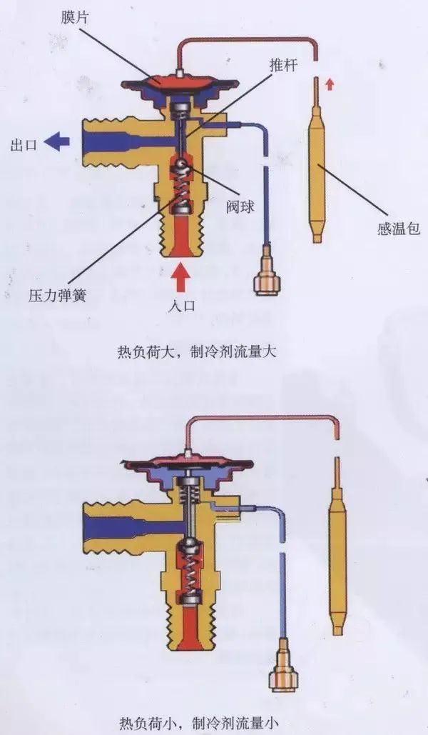 工作時,固定在蒸發(fā)器出口管道上的感溫包感應(yīng)蒸發(fā)器出口的過熱溫度,使感溫包內(nèi)產(chǎn)生壓力,并由毛細(xì)管傳到膜片上部的空間,在壓力的作用下膜片以彈性變形的方式把信號傳遞給頂針(執(zhí)行機構(gòu)),從而調(diào)節(jié)閥們的開度,控制制冷劑的流量。