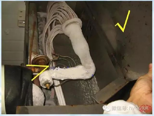 另外當(dāng)系統(tǒng)中出現(xiàn)膨脹閥供液時多時少或膨脹閥關(guān)不小,過熱度,過冷度不正確等現(xiàn)象時,原因可能就是感溫包出了故障。感溫包故障包括毛細(xì)管斷裂,使感溫包內(nèi)的充注物漏掉,導(dǎo)致不能把正確的信號傳給熱力膨脹閥的執(zhí)機構(gòu),以及感溫包包扎位置不正確。