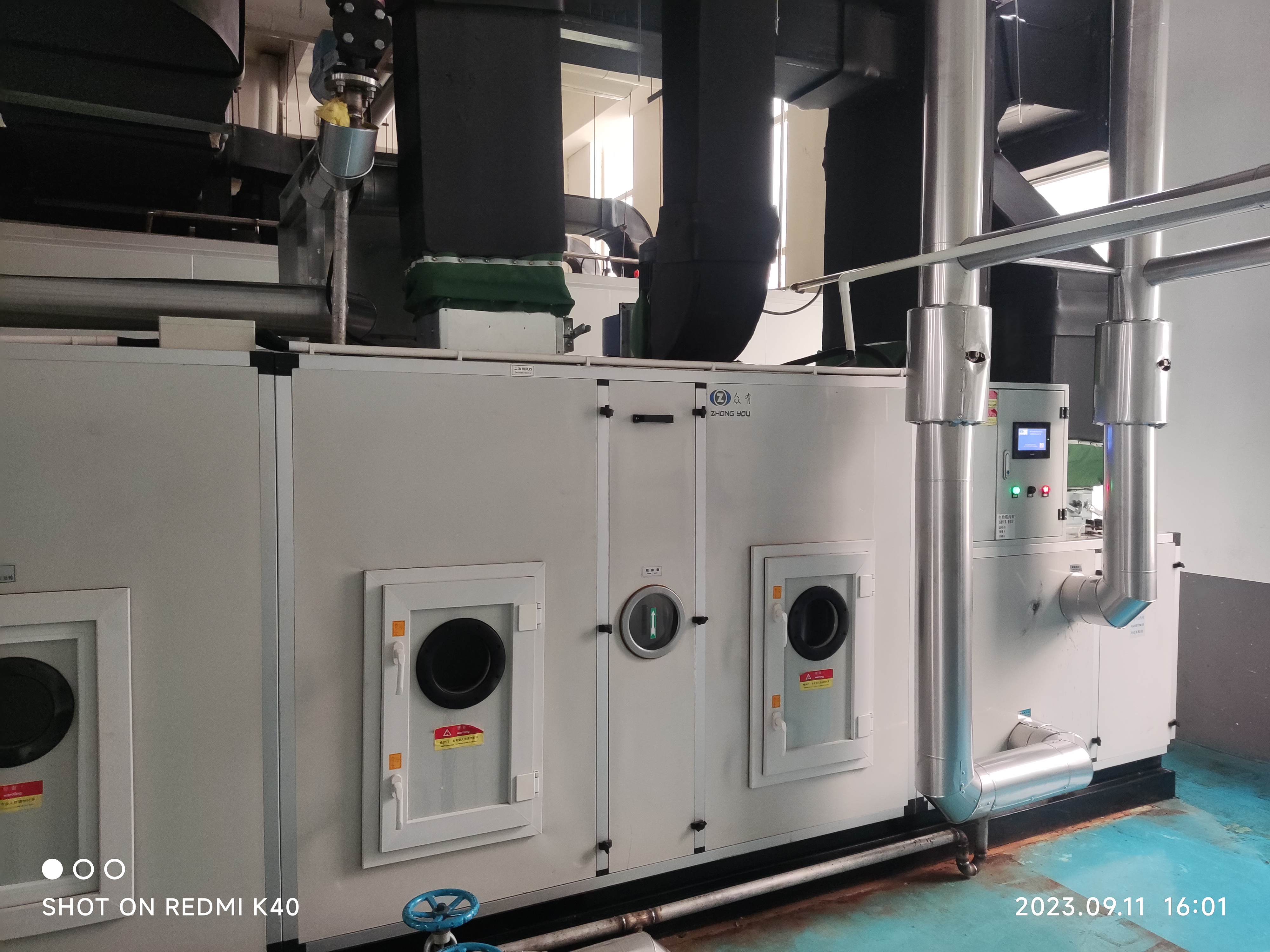 眾有組合式轉(zhuǎn)輪除濕機(jī)采用不斷轉(zhuǎn)動(dòng)的蜂窩狀硅膠轉(zhuǎn)輪作為核心部件,具有高效吸濕和除濕的特點(diǎn)。轉(zhuǎn)輪內(nèi)部由密封板將表面分成除濕處理區(qū)域和再生區(qū)域,實(shí)現(xiàn)了連續(xù)穩(wěn)定的工作狀態(tài)。