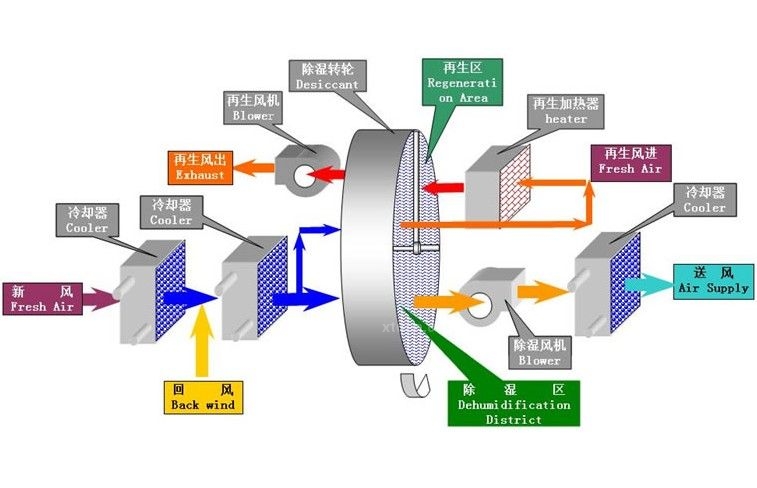 與此同時,再生的空氣經過過濾、加熱到120±10℃,通過相反方向進入轉輪剩下的1/4的區域。將緩慢進入再生區域的附著在特殊纖維上的吸濕劑的溫度升高,使附著在特殊纖維上的吸濕劑所含水分汽化,并被帶出轉輪,使附著在特殊纖維上的吸濕劑恢復吸濕功能,即吸濕劑得到再生。