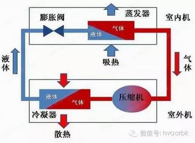 制熱的時候有一個叫四通閥的部件,使冷媒在冷凝器與蒸發器的流動方向與制冷時相反,所以制熱的時候室外吹的是冷風,室內機吹的是熱風。其實就是用的初中物理里學到的液化(由氣體變為液態)時要排出熱量和汽化(由液體變為氣體)時要吸收熱量的原理。