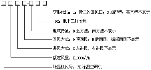 型號示例: CK12-DX 表示名義風量為12000m3/h,回風方式為端部回風的南方型地下工程用除濕空調(diào)機,面對機組控制器,回風口在右側(cè)。