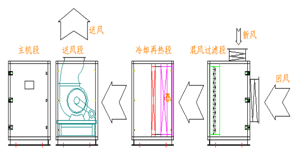 地下工程用除濕空調(diào)機采用模塊化設計理念和組合式結(jié)構(gòu),由混風過濾段、冷卻再熱段、送風段和主機段組合而成。自由拼裝,連接簡單,拆卸方便。