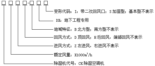 型號示例: CK12-DX 表示名義風量為12000m3/h,回風方式為端部回風的南方型地下工程用除濕空調(diào)機,面對機組控制器,回風口在右側(cè)。